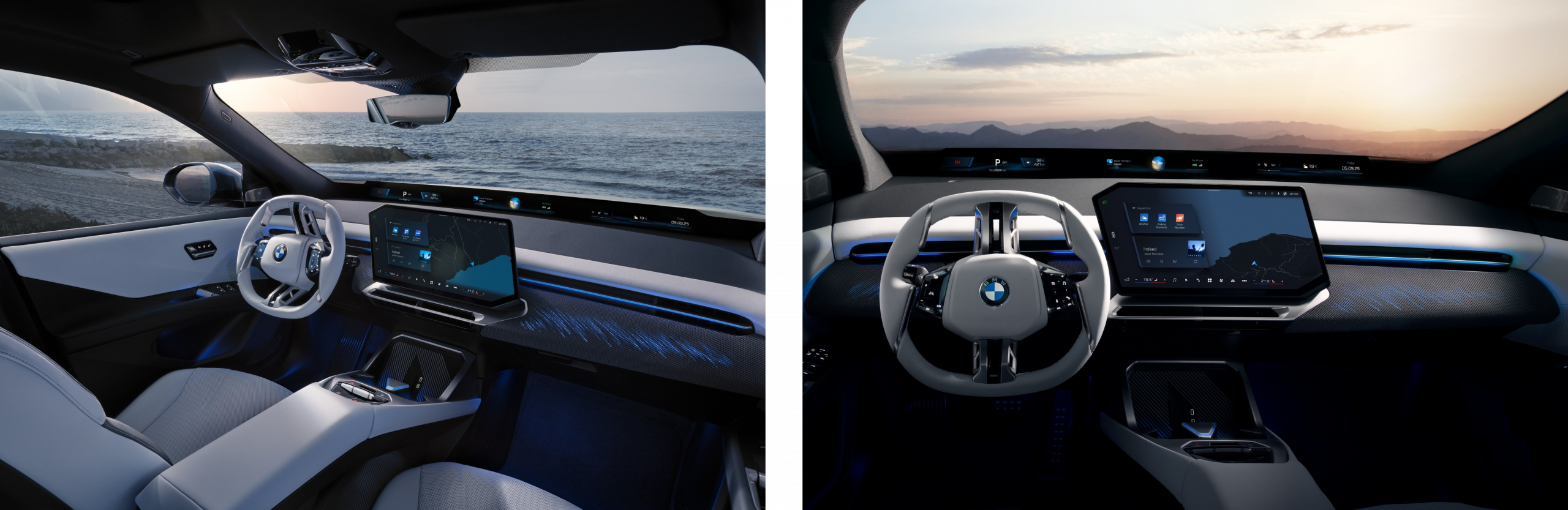 Otra influencia destacada en el tablero de instrumentos horizontal es el nuevo sistema de control/operación BMW Panoramic iDrive, que se basa en el recién desarrollado BMW Operating System X. Reúne pantallas, geometría, diseño de luz y sonido en una experiencia holística, personalizable a través de My Modes. También participan en esto los nuevos sonidos de conducción, efectos y señales sonoros del paisaje acústico BMW HypersonX, creado específicamente para la Neue Klasse.
