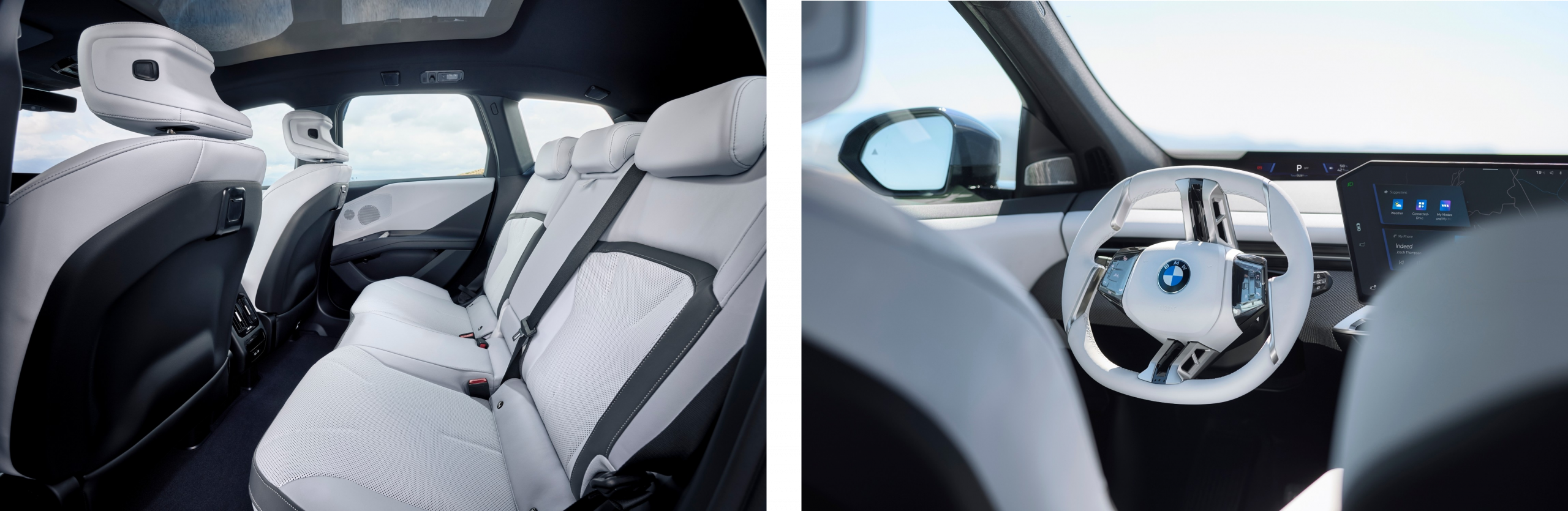 Los mundos interiores cuidadosamente diseñados aportan un carácter único y totalmente distinto a cada paquete de equipamiento. Los materiales y esquemas de color seleccionados están inspirados en el diseño interior moderno y en la avanzada tecnología de la Neue Klasse, y se coordinan de manera armoniosa entre sí. Por lo tanto, contribuyen de manera visible y notable al nivel excepcional de confort a bordo del nuevo BMW iX3. Una atractiva gama de colores permite la combinación perfecta entre los tonos interiores y los acabados exteriores. Como alternativas al diseño interior Essential en Vivid Grey con tapicería Econeer, los clientes también pueden elegir entre tres composiciones más, en Veganza, el mundo interior BMW M en Veganza y M PerformTex, y la opción BMW Individual con una combinación de cuero Merino de alta calidad y M PerformTex en Negro Bicolor o Gris Adelaide.