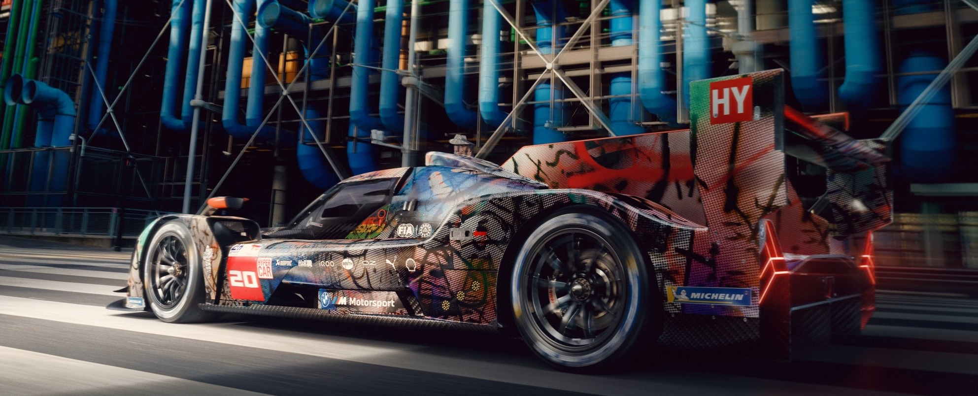 La fusión de imagen y vehículo se realizó con la ayuda del mapeo 3D, con el cual el motivo se transfirió a los contornos del vehículo. Un recubrimiento permite que el BMW M Hybrid V8 completamente cubierto por la obra de Mehretu compita en las 24 Horas de Le Mans. Los pilotos de BMW M Motorsport Sheldon van der Linde (RSA), Robin Frijns (NED) y René Rast (GER) inscribirán el 20º BMW Art Car con el número de salida 20 en el Circuito de la Sarthe el 15 de junio. Al igual que ellos, Mehretu también espera con ansias la carrera: "Fui a ver correr al BMW M Hybrid V8 en Daytona, y esa experiencia fue abrumadora. Diseñadores, ingenieros, expertos en aerodinámica y tantas otras mentes creativas están trabajando para llevar este vehículo al extremo. Cuando salga a la pista de carreras, se cumplirán muchos sueños".