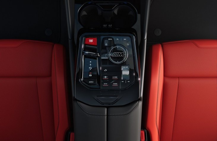 La consola central específica M proporciona acceso rápido a las funciones clave, como el botón rojo de arranque y parada, el controlador iDrive y los modos M.